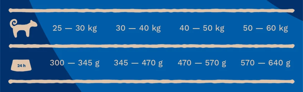 Analytical constituents: Protein 25.0%, Fat content 13.0%, Omega-6 fatty acids 2.4%, Omega-3 fatty acids 0.5%, Crude ash 7.5%, Crude fibre 3.0%, Moisture 9.0%, Calcium (Ca) 1.6%, Phosphorus (P) 1.3%.